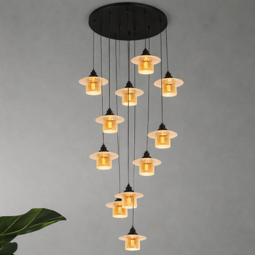 The LG-13552-13 Hanging Light features a contemporary multi-drop design with warm amber glass shades and a sleek black canopy. Its artistic hanging arrangement creates a stunning visual flow, making it a perfect centerpiece for staircases, double-height spaces, and modern interiors.