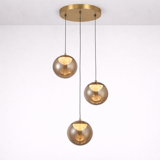 A modern hanging light featuring elegant amber glass globes with a metallic gold finish. Its warm LED glow and minimalist design create a stylish ambiance—perfect for dining areas, bedrooms, and contemporary interiors.