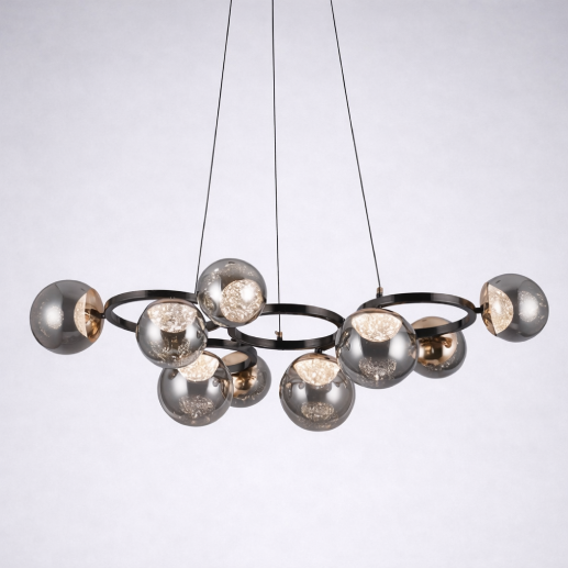 A sleek modern chandelier featuring smoke grey glass globes arranged across elegant metallic rings. With its refined black finish and warm LED glow, this lighting piece adds a contemporary and luxurious touch to living and dining spaces.