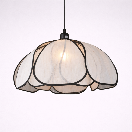 A beautifully crafted pendant light featuring a soft fabric shade with a natural plant fibre structure. Its floral-inspired design and warm illumination create a cozy and elegant ambiance—perfect for bedrooms, dining areas, and modern interiors.