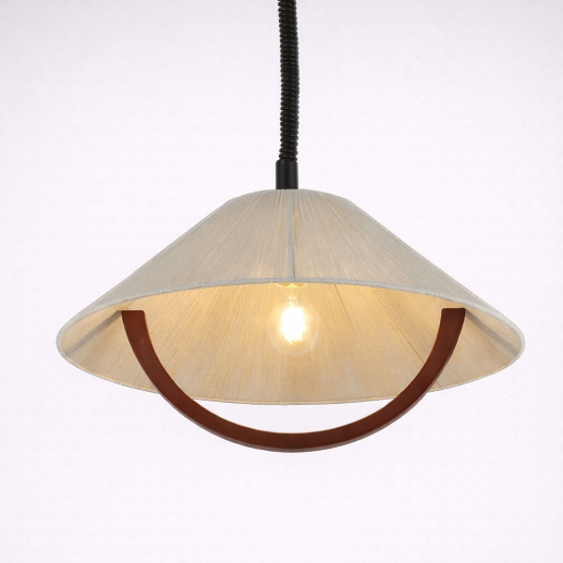A stylish pendant light featuring a soft hemp rope fabric shade with a warm beige walnut finish and a distinctive curved wooden accent. Its natural textures and warm glow create a cozy and modern ambiance—perfect for dining spaces, cafés, and contemporary interiors.
