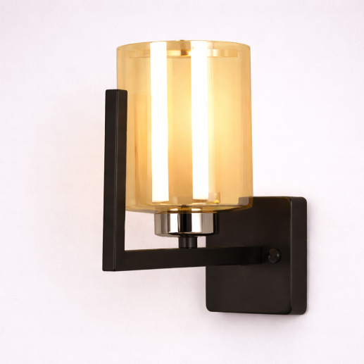 The ARC5125-B Wall Light features a sleek contemporary design with a cylindrical amber glass shade mounted on a minimalist black metal frame. Its warm diffused lighting creates a stylish and cozy ambiance—perfect for bedrooms, hallways, and modern interiors.