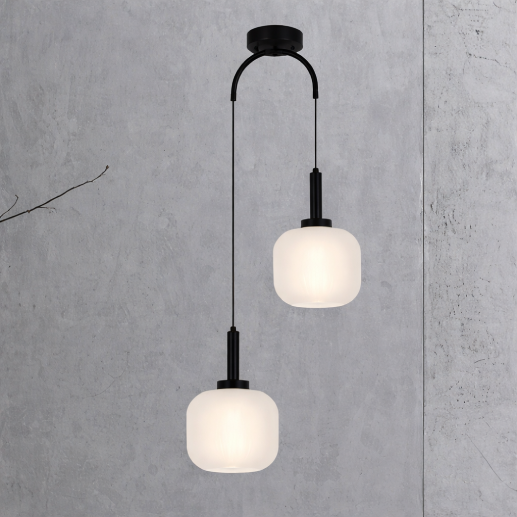 The ARC547-2 Hanging Light features a sleek dual-pendant design with smooth frosted white glass shades and minimal black metal accents. Suspended at different heights, it delivers a soft and calming glow—perfect for bedrooms, living spaces, and modern interiors.