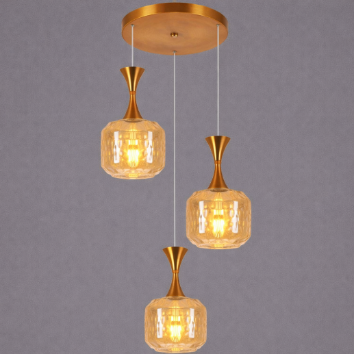 The ARC7116-3 Amber Hanging Light features a modern triple-pendant design with textured amber glass shades and elegant copper-finished accents. Suspended at varying heights, it delivers a warm and ambient glow—perfect for dining areas, kitchen islands, and contemporary interiors.