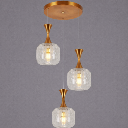 The ARC7116-3 Clear Hanging Light features a modern triple-pendant design with textured clear glass shades and elegant copper accents. Suspended at varying heights, it provides a warm and refined glow—perfect for dining areas, kitchen spaces, and contemporary interiors