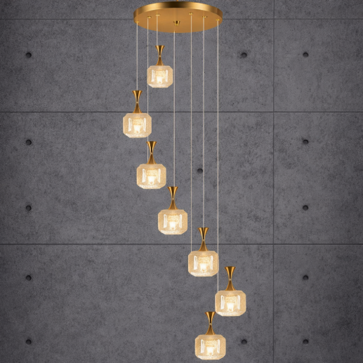 The ARC7116-7 Crystal Cube Cascade Chandelier features a sophisticated multi-drop design with textured crystal cube shades arranged in a cascading pattern. Finished in a rich copper tone with warm amber illumination, it creates a luxurious and elegant ambiance—perfect for staircases, double-height spaces, and premium interiors.