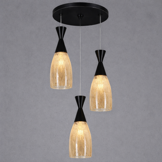 The ARC7133-3 Amber Hanging Light features a sleek triple-pendant design with textured amber glass shades and modern black metal accents. Suspended at varying heights, it emits a warm and inviting glow—perfect for dining areas, kitchen spaces, and contemporary interiors.