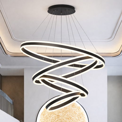 The ARC8143-4 Modern Spiral LED Chandelier features a striking contemporary design with interwoven spiral rings suspended in a cascading form. Finished in a sleek black frame with soft LED illumination, it creates a bold and artistic lighting statement—perfect for living rooms, staircases, and modern interiors.