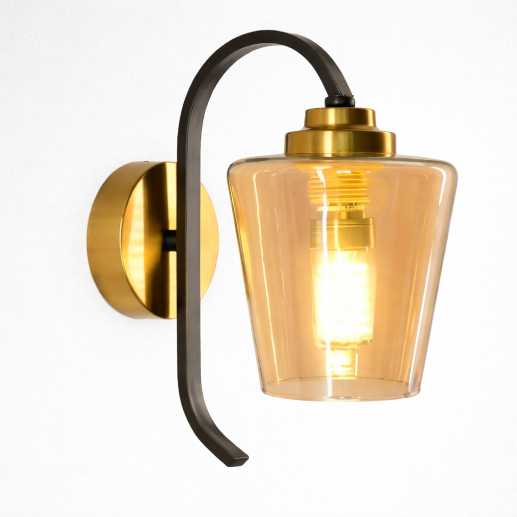 The B6001 Wall Light features a refined blend of modern and industrial design with an amber-tinted glass shade and a sleek black and gold metal frame. Its elegant curved arm and softly glowing LED bulb create a warm and inviting ambiance. Designed to complement contemporary and vintage-inspired interiors, this wall light adds both functionality and aesthetic appeal.