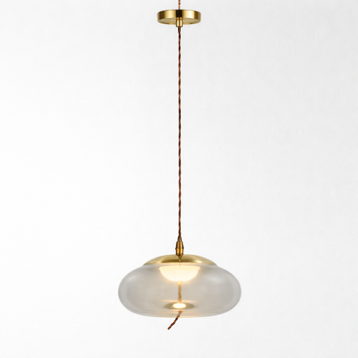 A modern pendant hanging light featuring a smooth amber glass shade with elegant copper accents. Its minimal design and warm glow make it perfect for cozy interiors and contemporary lighting setups.