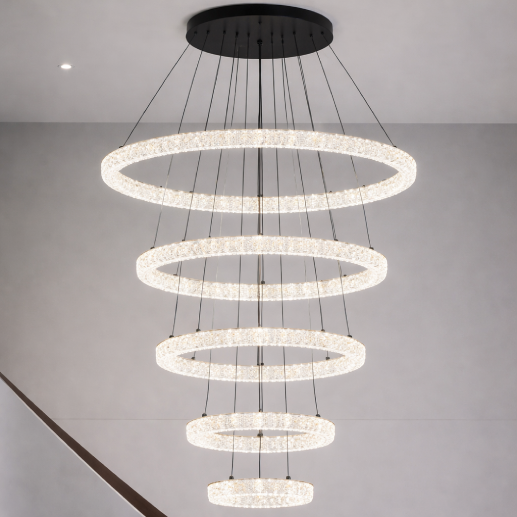 The CL2030-5 Crystal Ring Cascade Chandelier features a stunning multi-layered design with five illuminated crystal rings suspended at varying heights. Finished in a sleek black frame with sparkling clear crystal detailing, it creates a luxurious cascading effect—perfect for staircases, lobbies, and double-height interiors.
