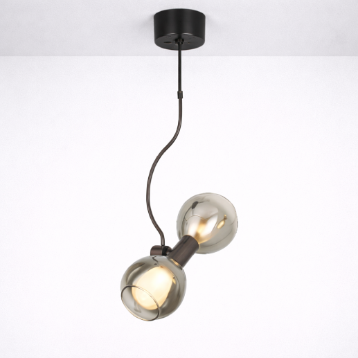 A stylish hanging light featuring dual smoke glass globes with a sleek pearl black finish. Its curved stem design and warm illumination create a modern and artistic look—perfect for bedrooms, corners, and contemporary interiors.
