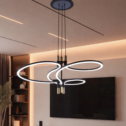 A modern designer pendant light featuring an artistic multi-ring structure with a sleek grey finish. Its flowing circular design provides a stylish ambient glow, making it perfect for contemporary living spaces and interiors.