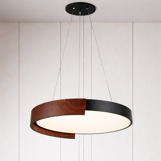The DY-2111 Orbit Wood Pendant Light features a striking circular design with a unique blend of matte black metal and rich mahogany wood finish. Its integrated LED lighting and suspended ring structure create a modern statement piece, perfect for enhancing contemporary interiors with warmth and style.