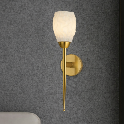 The DY-ZD021 Luxe Stem Wall Light features a sleek elongated stem paired with a softly textured diffuser in a refined copper and white finish. Its warm illumination and elegant vertical form create a sophisticated lighting accent, perfect for modern and premium interiors.