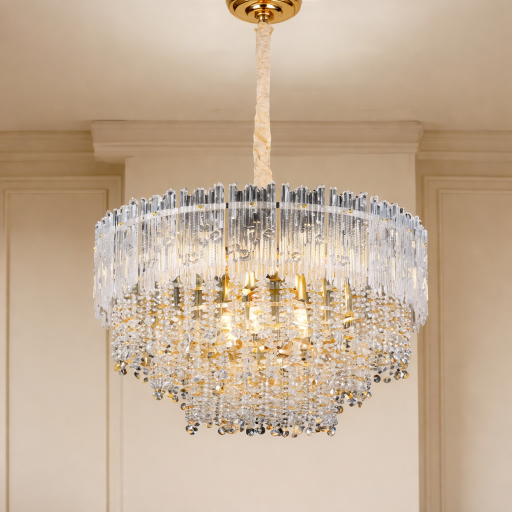 The DY3259-550 Crystal Radiance Chandelier features a refined circular design with cascading clear crystals and a rich gold finish. Perfect for elegant interiors, it delivers a warm glow with a luxurious and modern appeal.