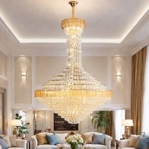 The DY330-12000 Imperial Cascade Chandelier is a breathtaking luxury centerpiece featuring a grand tiered crystal design with gold accents. Perfect for high ceilings and premium interiors, it creates a stunning visual impact with brilliant illumination and timeless elegance.