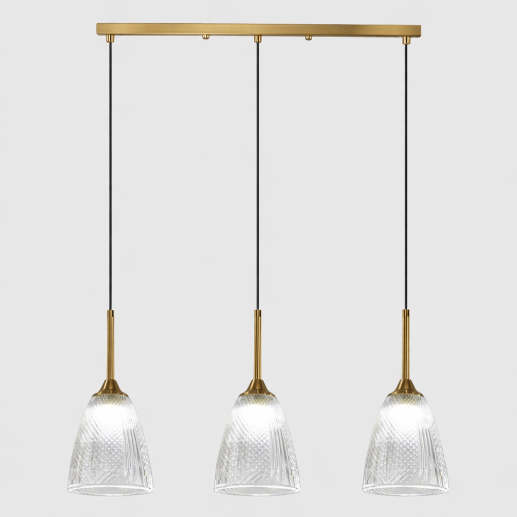 A stylish triple pendant hanging light featuring textured clear glass shades with elegant brass accents, perfect for adding a warm and sophisticated ambiance to dining areas and modern interiors.