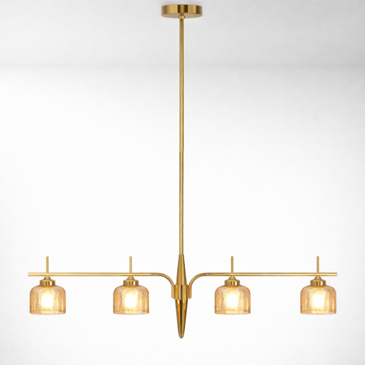 A stylish linear hanging light featuring four amber glass shades with an elegant gold finish, designed to provide warm ambient lighting while enhancing modern dining and living spaces.
