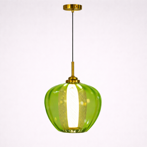 The LG 3611-1G Pendant Light features a unique and elegant design with a vibrant green glass shade and refined gold accents. Its artistic form combined with warm LED illumination creates a refreshing yet luxurious ambiance—perfect for modern interiors, dining spaces, and decorative lighting setups.
