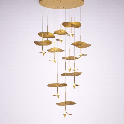 A modern cascading chandelier featuring artistic copper gold leaf-style elements suspended at varying heights. Its sculptural design and warm LED lighting create a sophisticated and luxurious ambiance—perfect for staircases and contemporary interiors.