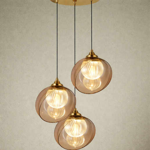 The LG4066-3 Hanging Light features a modern triple-pendant design with spherical glass shades and elegant copper accents. The combination of amber outer glass and ribbed inner diffuser creates a warm, glowing effect—perfect for dining areas, bedrooms, and contemporary interiors.