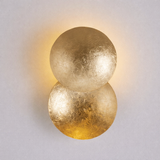 A modern decorative wall light featuring dual overlapping gold foil discs with a textured finish. Its soft backlit glow creates a warm halo effect, adding a luxurious and artistic touch to contemporary interiors.