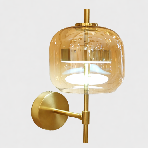 A contemporary wall light featuring a stylish amber glass shade with a brushed brass finish, designed to provide warm and elegant illumination while enhancing modern interior aesthetics.