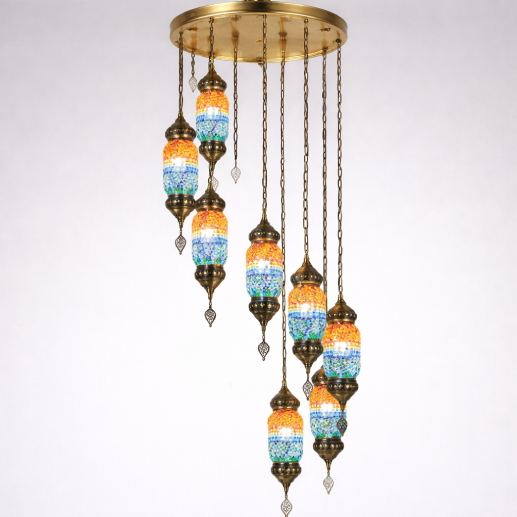The LK1015-10F Turkish Pendant Chandelier features a vibrant multi-drop design with intricately handcrafted mosaic glass shades. Suspended from elegant antique-finish chains, each pendant glows with rich multicolor patterns, creating a warm and artistic ambiance—perfect for living rooms, cafes, and decorative interiors.