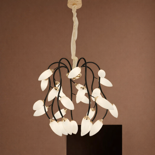 The 18596-28 LED Chandelier features an artistic floral-inspired design with gracefully curved black arms and elegant leaf-shaped diffusers. Accented with subtle gold detailing and warm LED lighting, it creates a soft, luxurious ambiance—perfect for living rooms, bedrooms, and contemporary interiors.