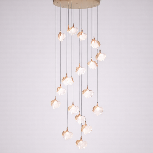A beautifully designed cascading chandelier featuring elegant ginkgo leaf-inspired shades in a soft white finish with gold accents. Suspended at varying heights, it creates a graceful flowing effect with warm LED lighting—perfect for luxury interiors and staircases.
