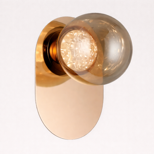 A stylish wall light featuring an amber glass globe paired with a sleek metallic gold backplate. Its warm LED glow and modern design add a luxurious accent—perfect for bedrooms, hallways, and contemporary interiors.