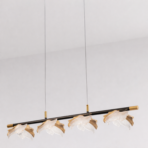 A luxurious linear pendant hanging light featuring elegant floral-inspired glass elements with a stunning royal gold and pearl black finish. Designed to enhance modern interiors with a blend of sophistication and artistic charm.