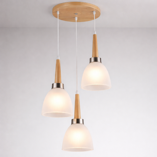 The ARC5123-3 Pendant Hanging features a clean and modern design with three hanging frosted glass shades complemented by natural wooden accents. Its soft diffused lighting creates a warm and calming ambiance—perfect for bedrooms, dining areas, and minimalist interiors.