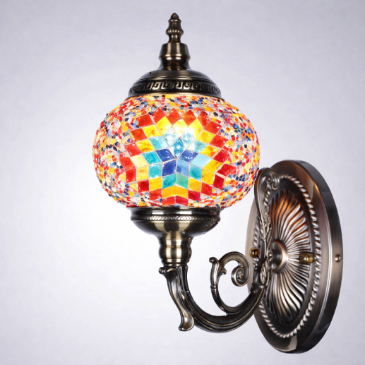 The BD5019 Wall Light features a stunning multicolor mosaic glass design with a vibrant geometric pattern that creates a beautiful ambient glow. Its antique-style wall mount combined with durable glass and iron construction adds elegance and character to any space. Perfect for decorative lighting, this wall light enhances interiors with a warm and artistic touch.