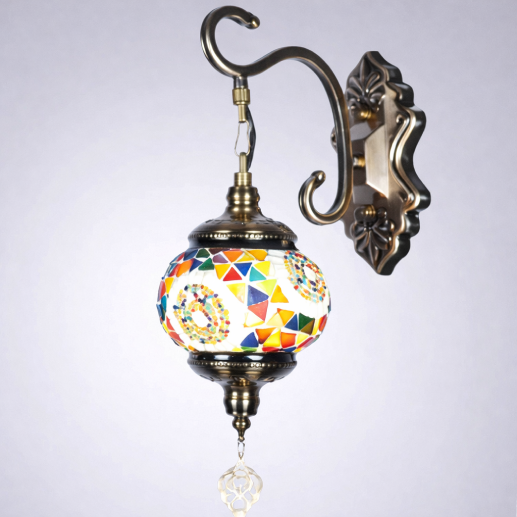 The BD5027-1B Wall Light features a vibrant multicolor mosaic glass design with unique geometric patterns that create a lively and artistic glow. Its elegant curved wall arm combined with a sturdy glass and iron structure enhances both durability and style. Perfect for decorative lighting, this wall light adds a colorful and sophisticated touch to interiors.
