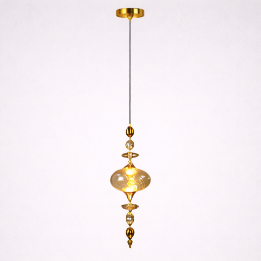 The CD 10955-1 Pendant Light features an artistic and decorative design with elegant amber glass and gold-toned accents. Its layered ornamental structure creates a warm and luxurious glow, making it a perfect statement piece for premium interiors, living spaces, and decorative lighting setups.