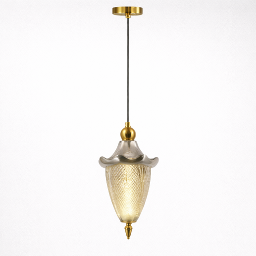An elegant vintage-style pendant hanging light featuring a textured glass shade in a smoke grey finish with refined gold accents. It emits a warm ambient glow, making it perfect for classic and contemporary interiors.