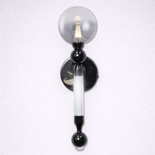 A modern wall light featuring a sleek combination of clear glass globe and frosted tube design with pearl black accents. Its contemporary structure and soft warm illumination make it a perfect choice for stylish interiors and ambient lighting.