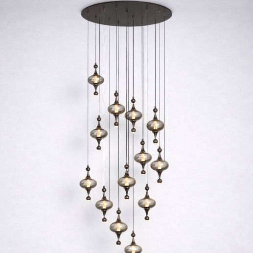 A sleek cascading chandelier featuring clear glass globes paired with slim LED tube elements, suspended at varying heights. Its modern linear design and warm illumination create a sophisticated statement—perfect for contemporary interiors and staircases.