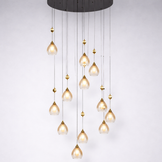An elegant cascading chandelier featuring amber glass pendants with bronze accents, suspended at varying heights for a luxurious visual effect. Its warm illumination and refined design make it perfect for staircases, living rooms, and double-height interiors.
