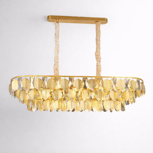 The DY18024-L300 Aurum Linear Chandelier features a sleek rectangular design with cascading gold and clear crystal elements. Perfect for modern dining spaces, it delivers a refined glow with a luxurious contemporary finish.