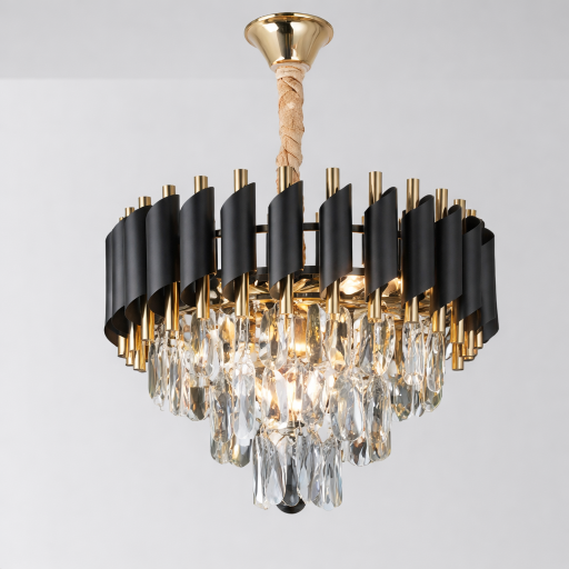The DY3016-300 BK Crystal Chandelier features a bold spiral design with matte black metal accents and shimmering clear crystal drops. Its modern aesthetic combined with warm illumination makes it a striking centerpiece, perfect for adding depth and luxury to contemporary interiors.