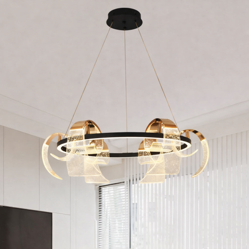 The DY9818-6 LED Chandelier features a modern circular design with artistic crystal wave elements and a refined copper finish. Its balanced ring structure combined with soft LED illumination creates a luxurious and elegant ambiance—perfect for living rooms, dining areas, and contemporary interiors.