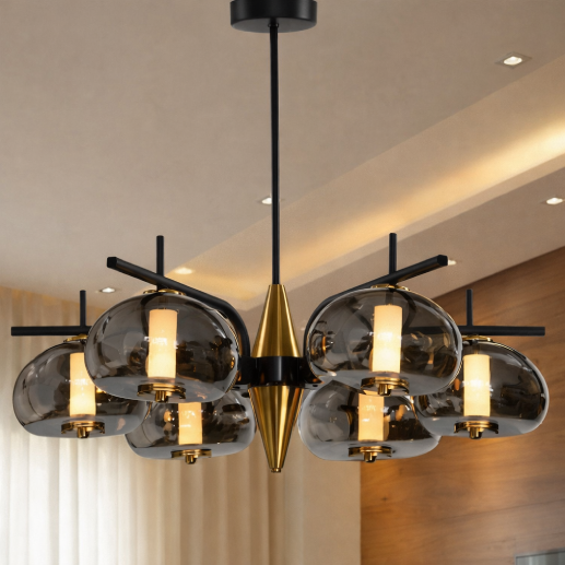 The LG 106-6 Smoke Chandelier Light features a bold modern design with elegant smoke grey glass shades and a refined metal frame. Its multi-light arrangement provides balanced illumination while adding a sophisticated touch to interiors—perfect for living rooms, dining areas, and contemporary spaces.