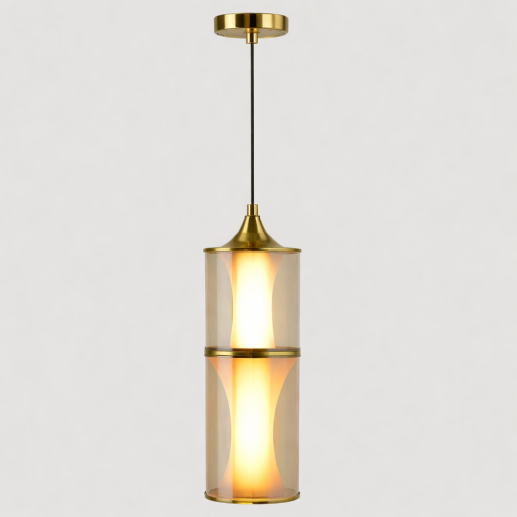 A modern cylindrical pendant hanging light featuring a stylish amber glass shade with elegant gold detailing. Its warm ambient glow and sleek design make it ideal for contemporary interiors and decorative lighting.