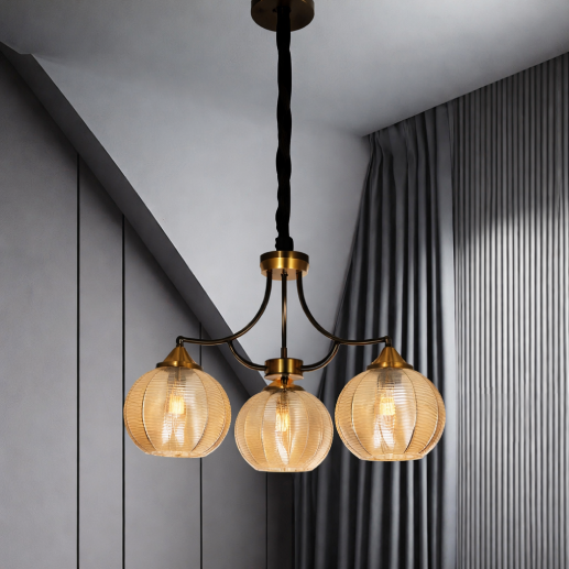 A stylish three-light pendant hanging fixture featuring ribbed glass shades with a warm copper finish. Designed to create a cozy and elegant ambiance, it’s perfect for dining areas, living spaces, and modern interiors.