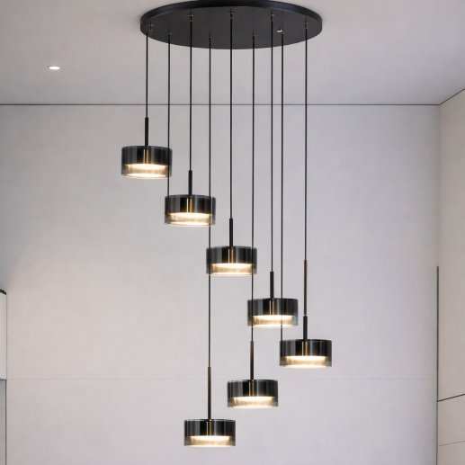 The LG 3620-7 Cascade Chandelier features a sleek multi-drop design with cylindrical drum-shaped pendants suspended at varying heights. Finished in a stylish smoky black tone with warm inner illumination, it creates a sophisticated and contemporary ambiance—perfect for staircases, dining areas, and modern interiors.