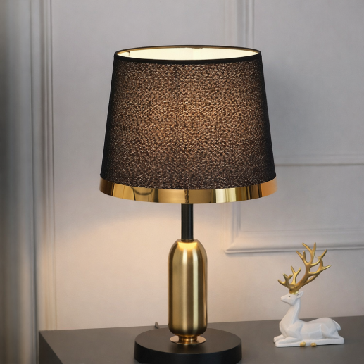 The LGT210-1 Table Lamp features a sophisticated blend of antique gold and black finishes, paired with a premium fabric shade that creates a warm and inviting glow. Its elegant design and sturdy iron construction make it a perfect addition to modern and classic interiors alike. Ideal for bedside tables or living spaces, this lamp adds both style and functionality to your décor.