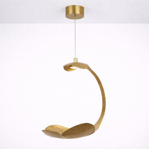 An artistic pendant light featuring a sculptural gold foil design with a sleek curved form. Its elegant structure and warm LED illumination create a luxurious statement—perfect for modern interiors and designer spaces.